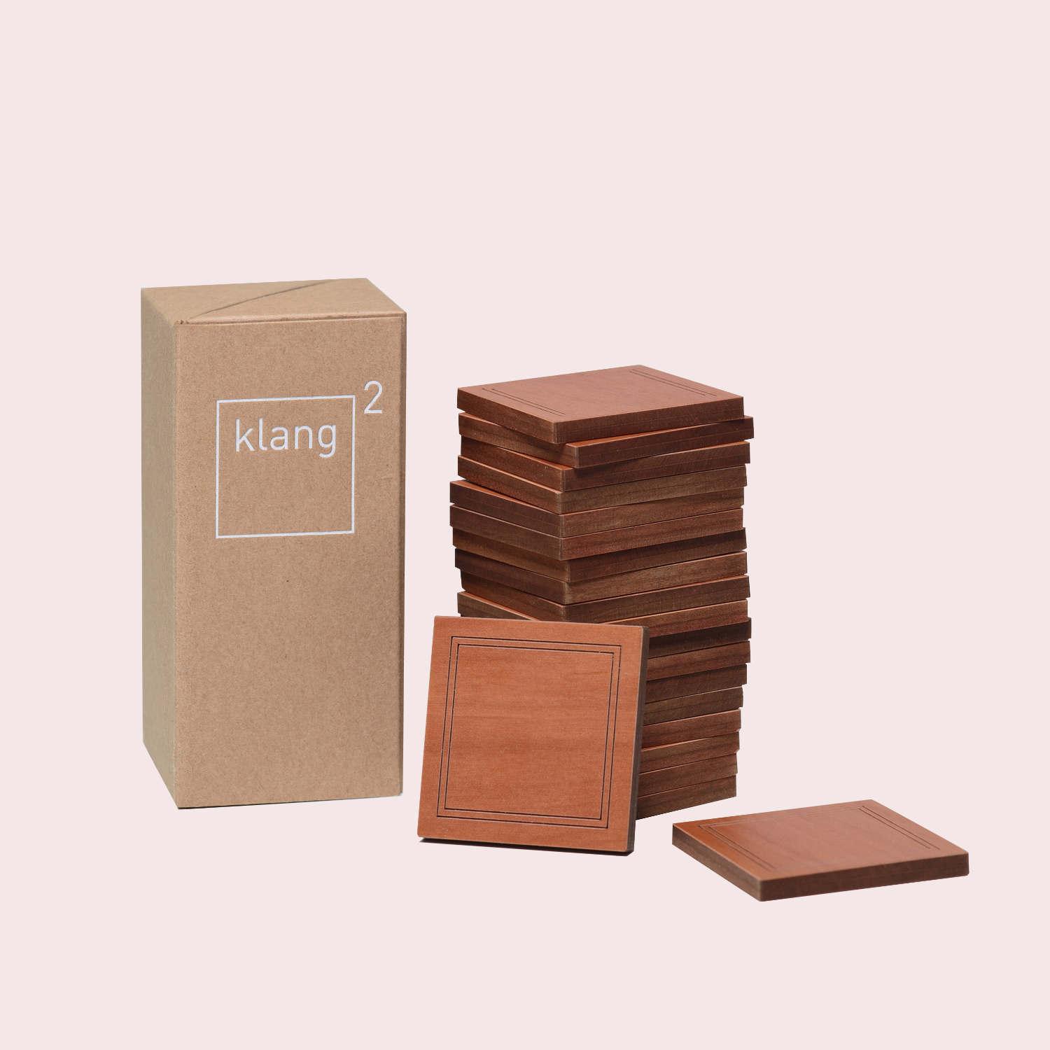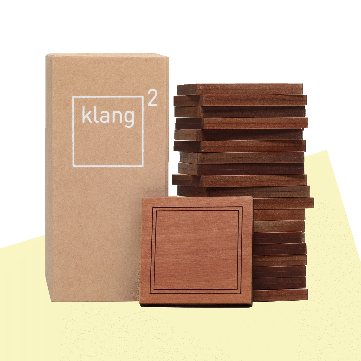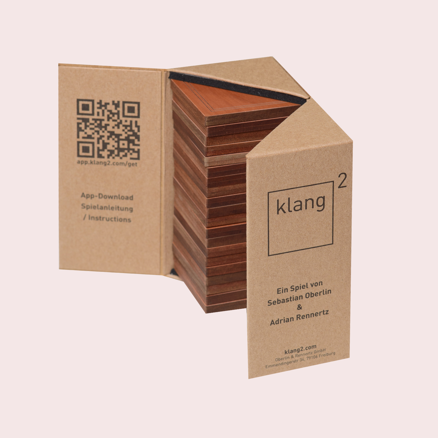 klang² consists of 20 elegant tolkens (klangs) made of high-quality tonewood (pear) equipped with microchips (NFC). The associated klang² app is available free of charge for Android and iOS and interacts with the klangs. These games are included in the app.
